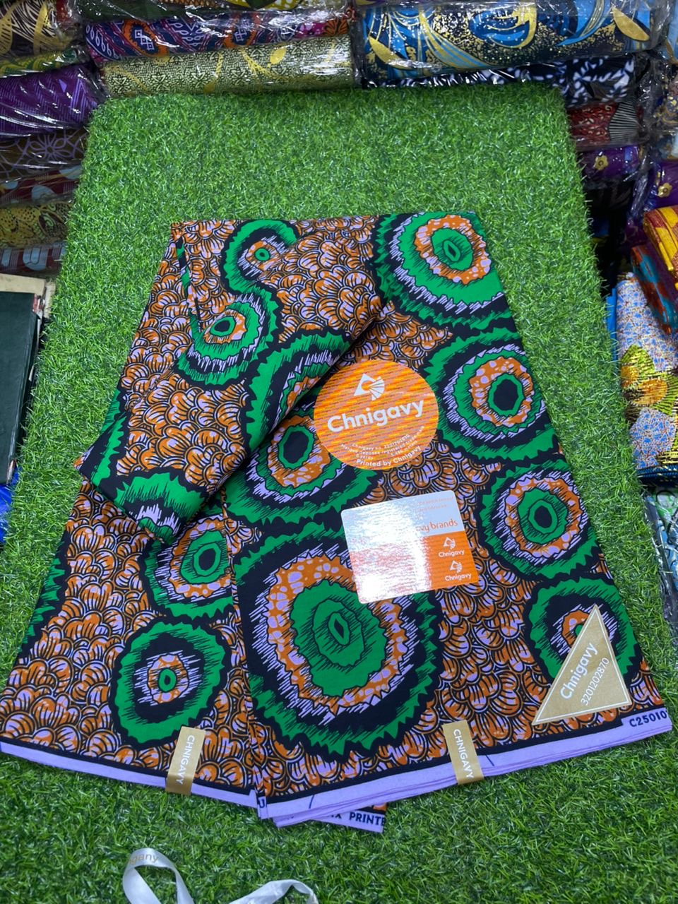 This Chinigavy wax print bursts with vibrant color and cultural artistry, featuring bold concentric circular motifs in green, orange, and black, layered over a background of textured floral clusters. The high-contrast design delivers both depth and energy, making it perfect for standout garments or décor. With its guaranteed block print quality, the fabric combines durability, comfort, and lasting vibrancy.